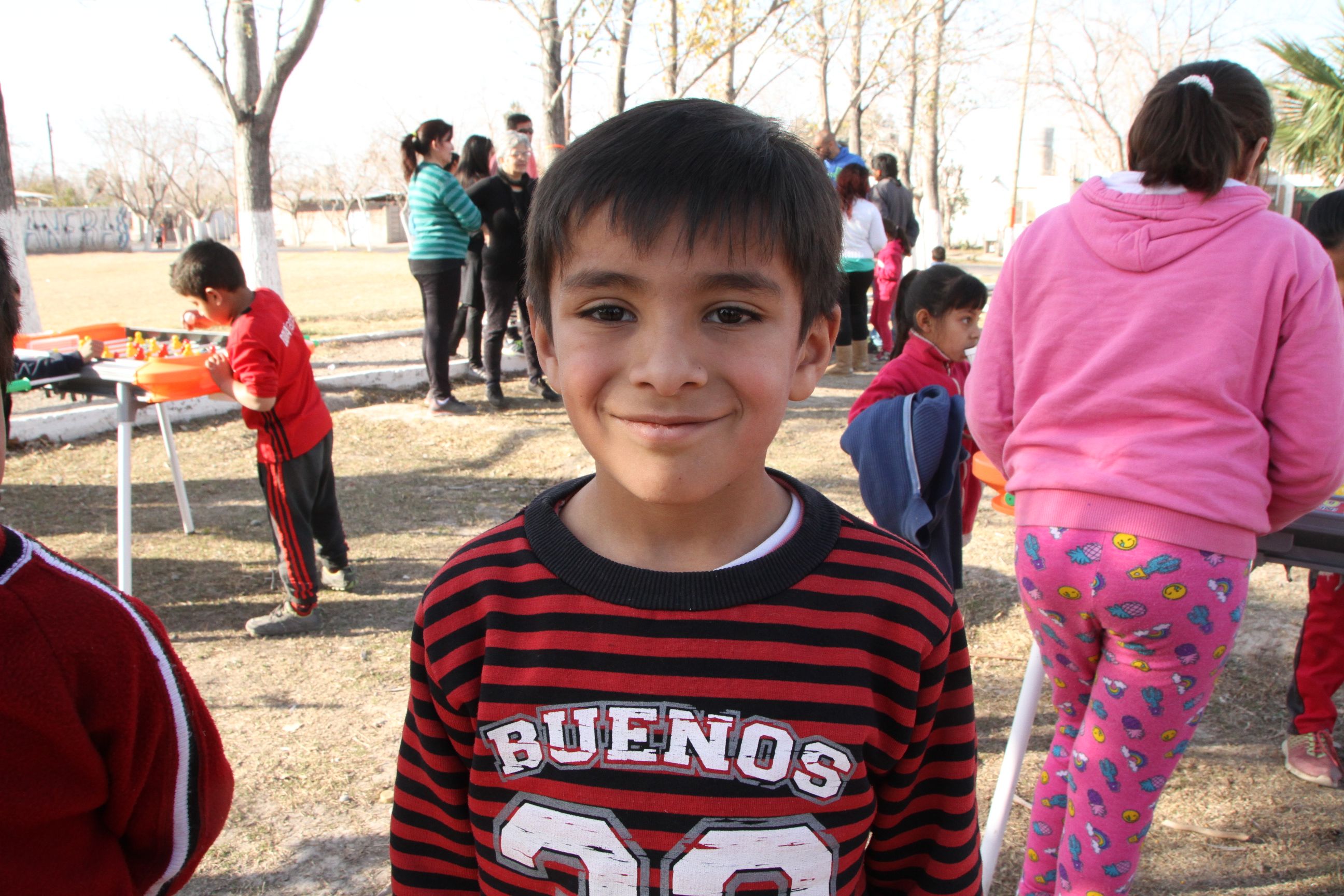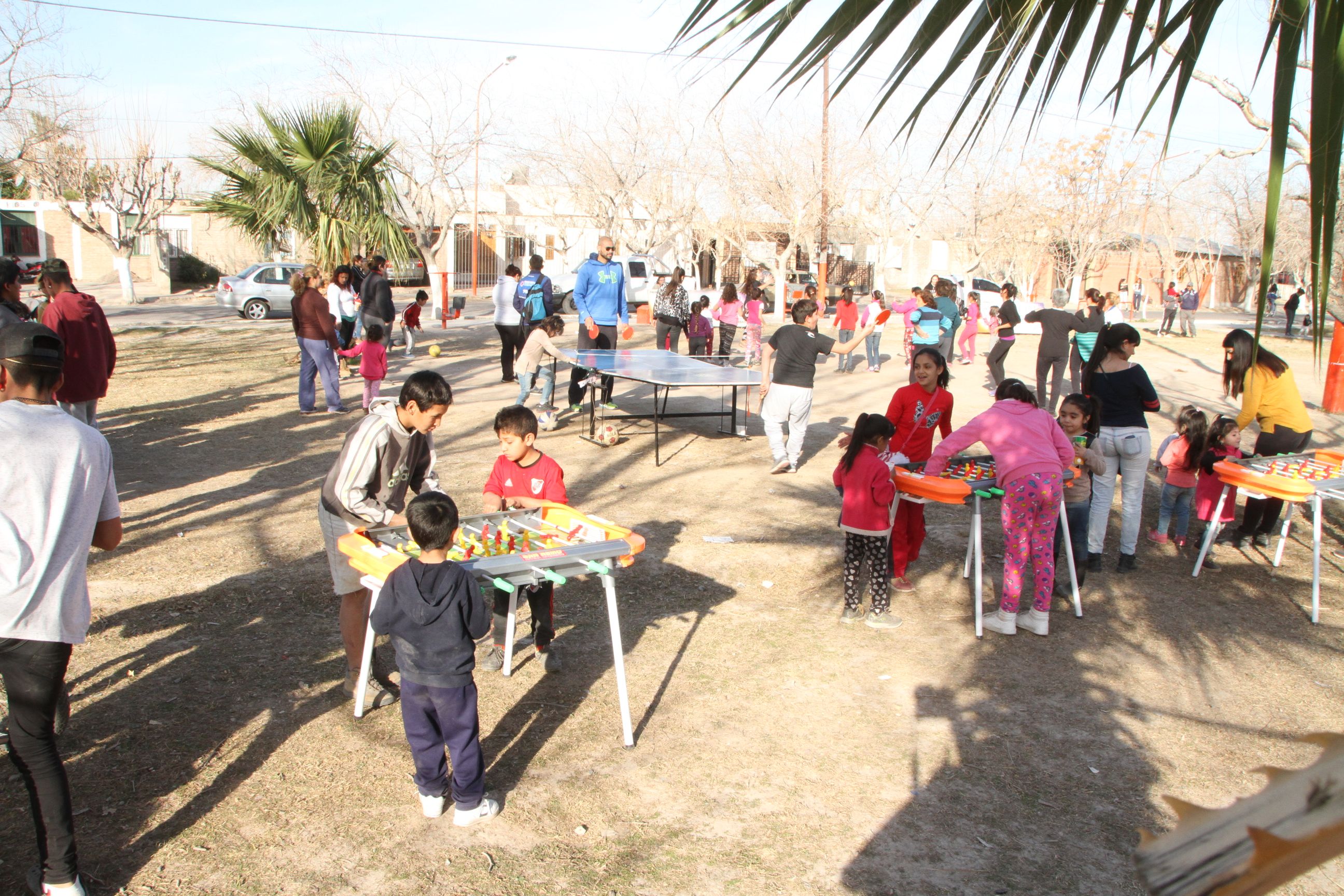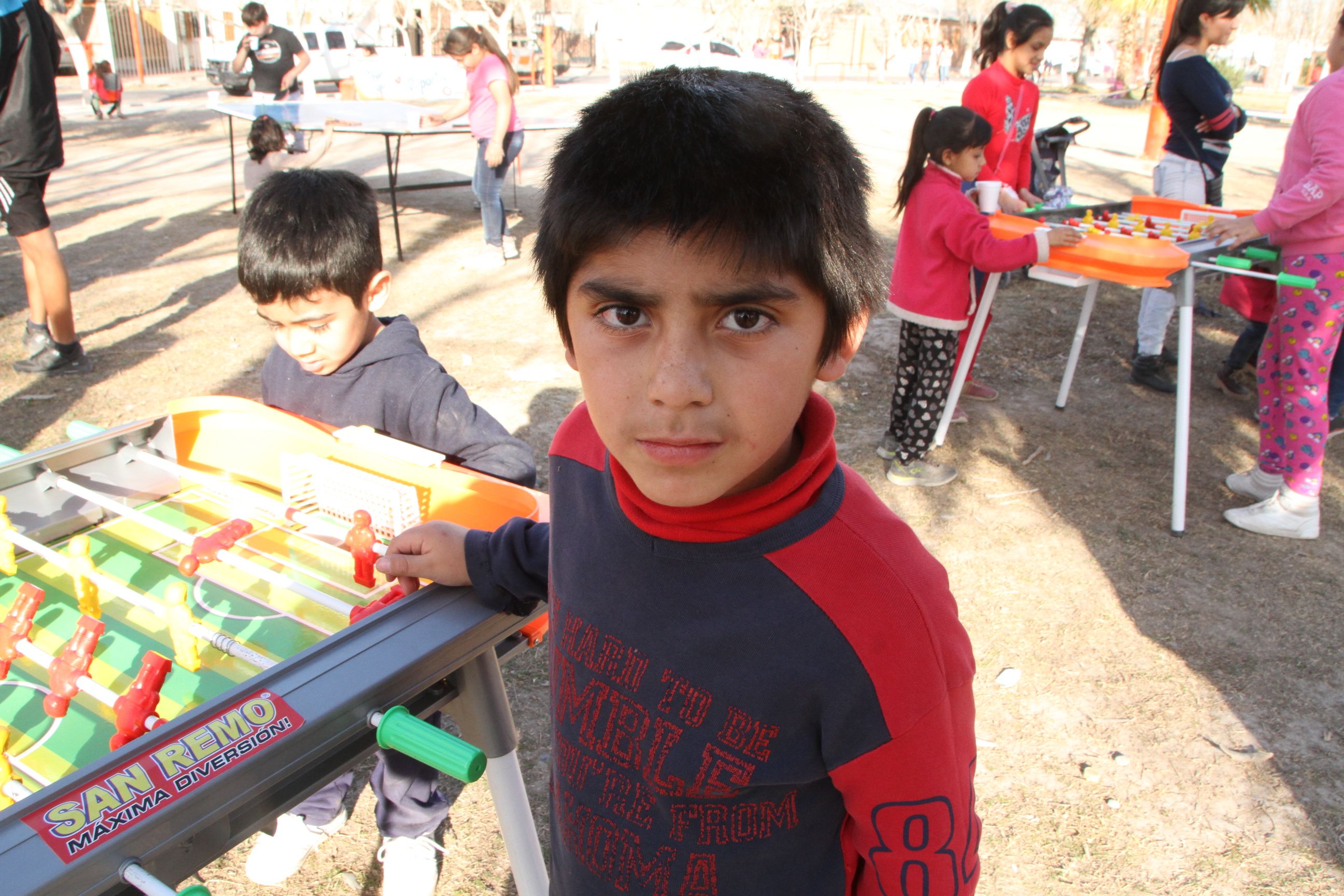 Si los 20 grados al sol ya eran una invitación para jugar en la plaza, los parlantes con música a buen volumen se encargaban de anunciar que algo fuera de lo cotidiano estaba pasando en el barrio. La red de voley atada entre dos árboles marcaba la improvisada cancha que, para un lado, se extendía hasta un veredín. Y del otro, hasta las tres flamantes mesas de metegol que no descansaron en ningún momento. Más atrás la cancha de fútbol tenis albergaba duelos de 2 contra 2 que se iba transformando hasta un 4 contra 6, considerando el handicap de los players (menores de 5 años prácticamente veían el partido adentro de la cancha). La profe de zumba tuvo en los primeros temas un grupo de niñas y al final, la mayoría de las madres estaban tan entusiasmadas como los propios agasajados siguiendo los pasos y el ritmo. La mesa de ping pong también era un gran atractivo, especialmente cuando los chicos podían enfrentar al coordinador de la propuesta, el "gigante’ Gustavo Molina.