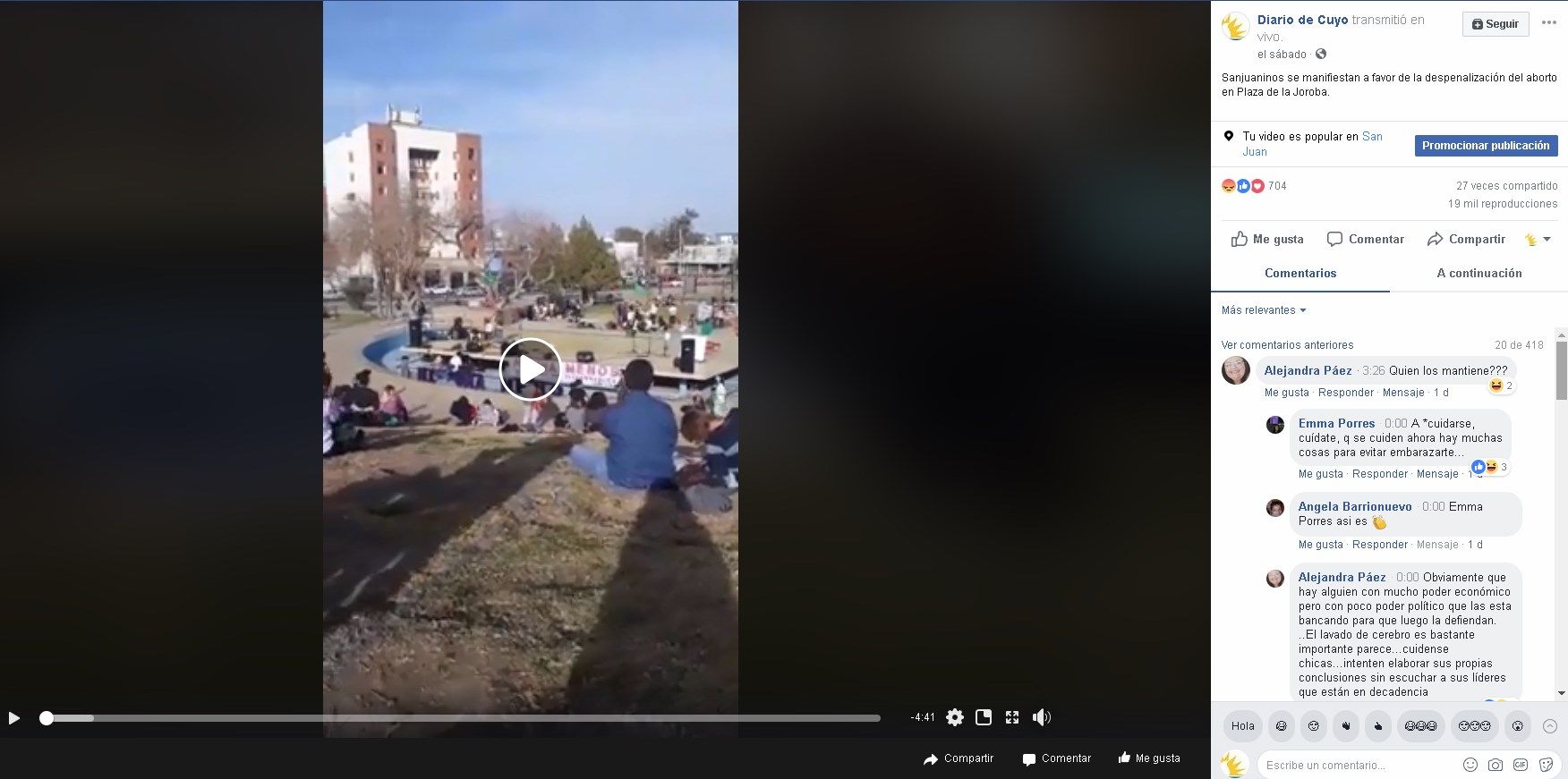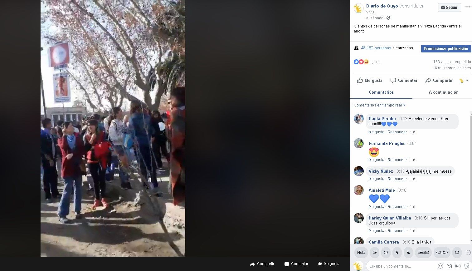 El pasado sábado se llevaron a cabo en San Juan dos manifestaciones sobre el aborto. Una, en Plaza Laprida, contra la legalización de la interrupción voluntaria del embarazo. La otra, en Plaza Hipólito Yrigoyen, a favor de la despenalización. DIARIO DE CUYO cubrió ambos eventos y, con números, las redes sociales hablaron por sí solas.