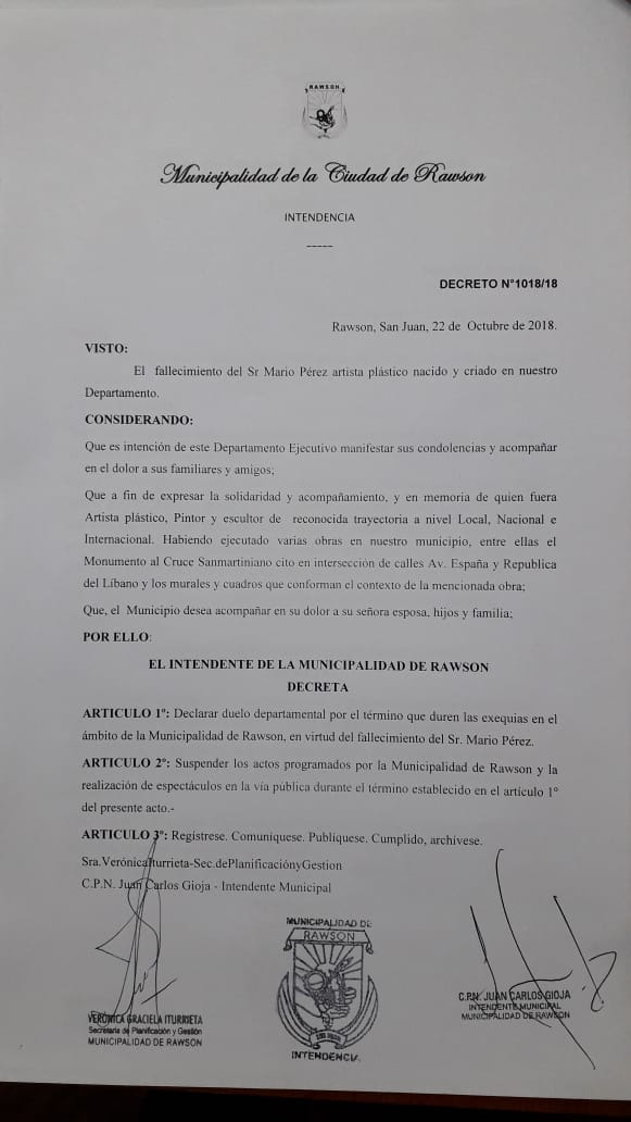Por el fallecimiento del reconocido artista, Mario Pérez, desde la Municipalidad de Rawson, ciudad de donde era oriundo, decretaron días de duelo departamental.