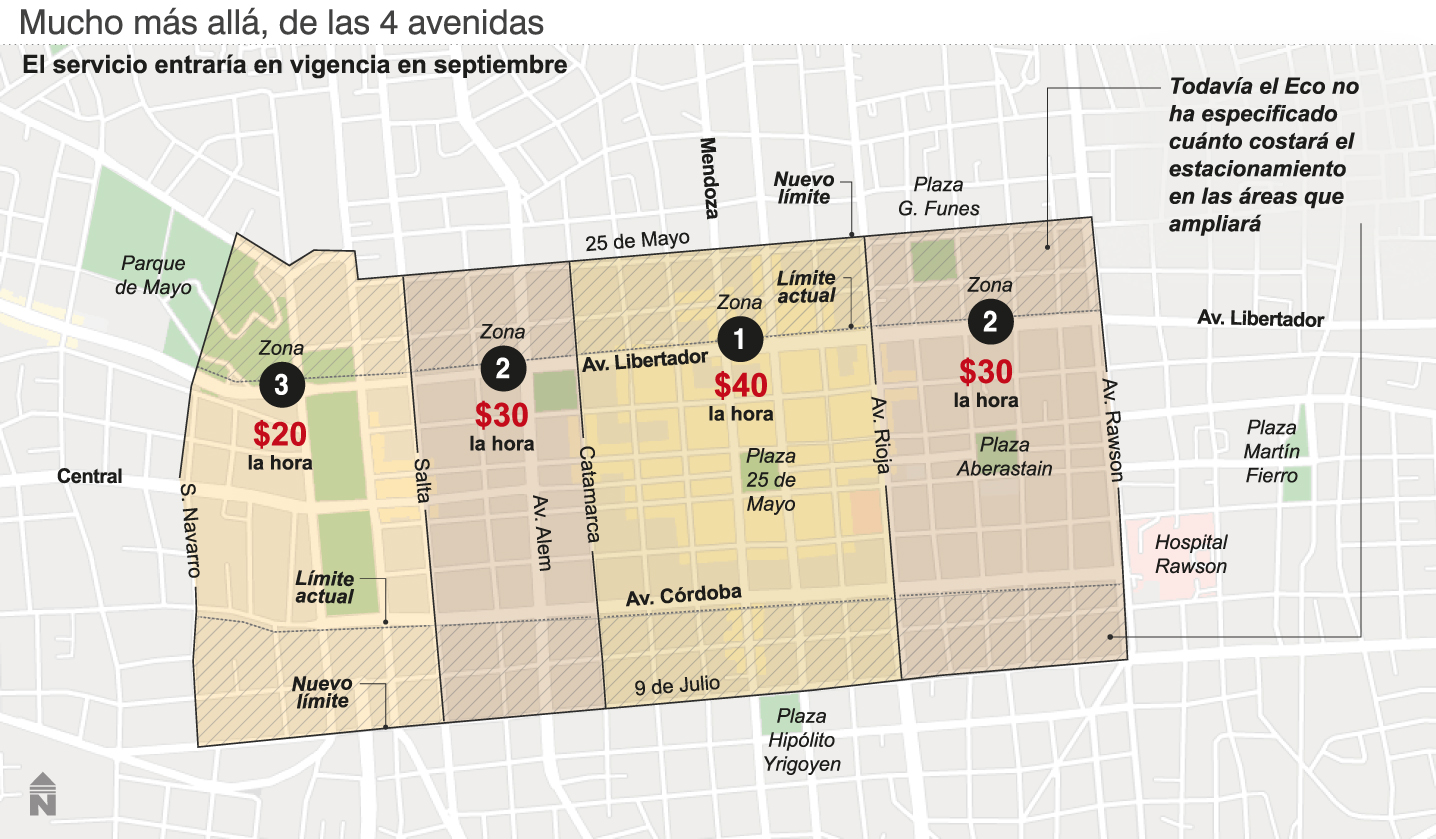 Actualmente el Eco tiene 3.500 boxes de estacionamiento (es decir que agregarán un 23%) distribuidos en 240 cuadras que abarcan desde Avenida Libertador hasta Avenida Córdoba y desde la Avenida Rawson hasta Segundino Navarro. Con la ampliación y en la zona Norte, se extenderá desde el límite de Libertador hacia 25 de Mayo y desde Avenida Rawson hasta el límite con calle Las Heras. La zona Sur, desde Rawson hasta la calle España y desde el límite de Avenida Córdoba hasta la calle 9 de Julio.