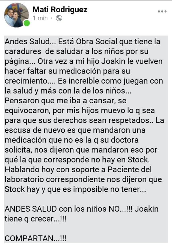 La familia de Joakín Rodríguez volvió a denunciar que la obra social Andes Salud dejó de hacerse cargo de las hormonas que el nene de 5 años necesita para sus problemas de crecimiento, misma enfermedad que sufrió de niño el astro argentino Lionel Messi.