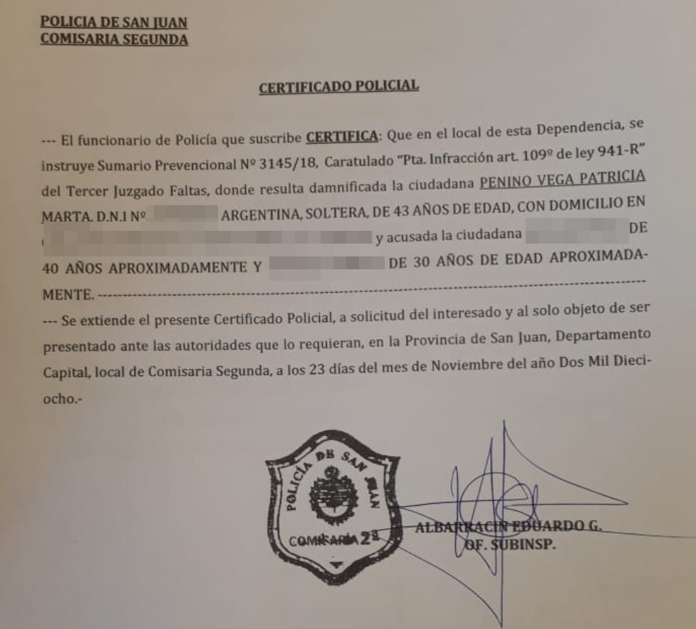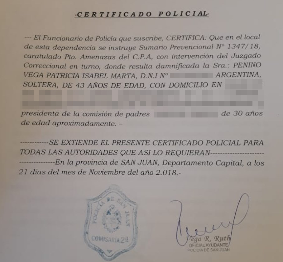 Momentos de terror vive Patricia Vega Penino (43) desde un tiempo a la fecha. La mujer se desempeña desde hace 3 meses como secretaria administrativa en la escuela Provincia Santiago del Estero, de Capital. En diálogo con DIARIO DE CUYO aseguró que desde el 21 de noviembre viene viviendo "una pesadilla" debido un inconveniente que tuvo con dos madres que indirectamente trabajan en el colegio.