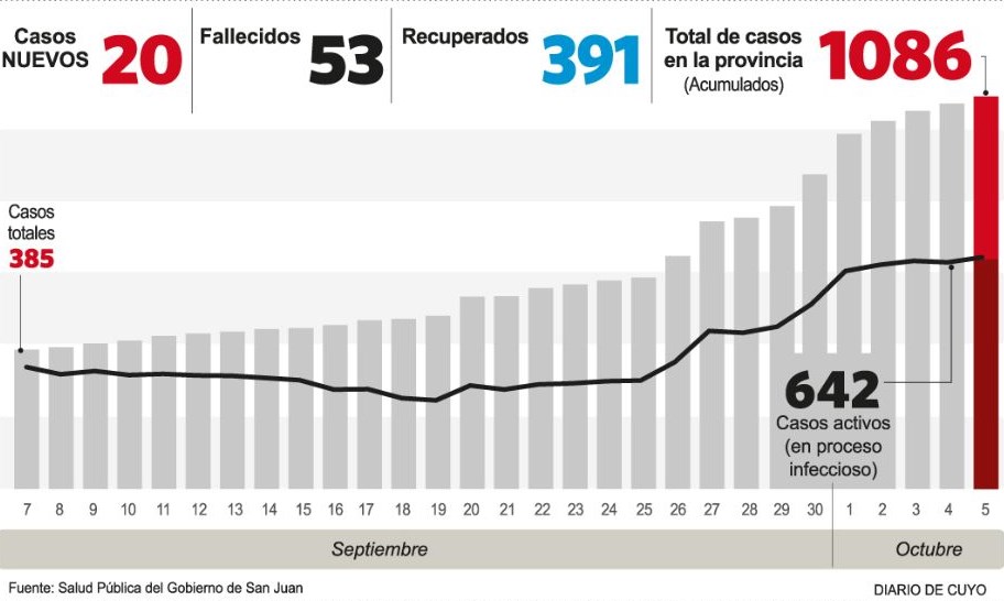 Por otro lado, el parte de Salud Pública indicó que hay 20 nuevos casos, por lo que el acumulado es de 1.086, de los cuales hay 642 pacientes con proceso infeccioso. Los muertos, en tanto, son 53. A su vez, con 5 altas, los recuperados totalizan 391.