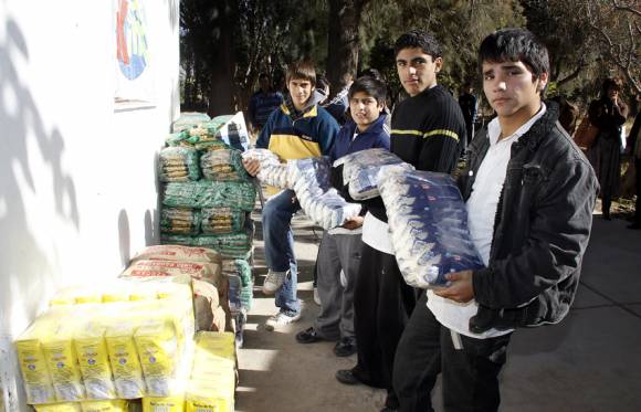 Ni bien llegó el cargamento, los chicos hicieron una cadena humana para trasladar los alimentos al salón de la escuela para almacenarlos y resguardarlos del sol. Empezaron con mucho entusiasmo y sin parar, pero con el correr de los minutos el cansancio se hizo sentir. La tarea continuó más lenta y con algunos recreos para recuperar energías. Es que los chicos ya habían trasladado los 200 kilos de leche, los 300 de harina y los 200 de azúcar, pero aún faltaban los 100 kilos de arroz y los 200 de fideos.