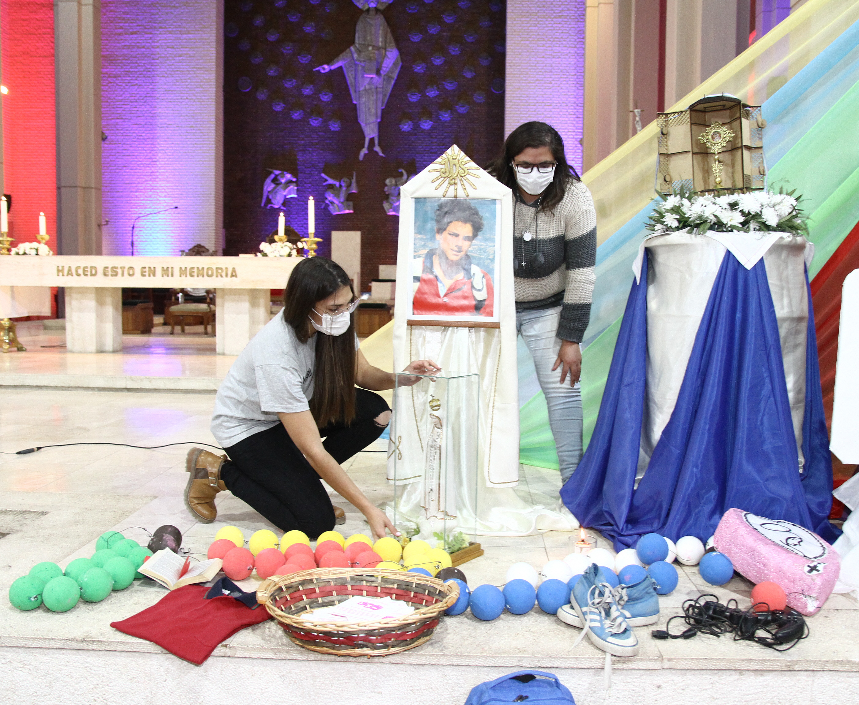 La alegría estuvo presente desde la previa del ingreso de las reliquias al templo. Hasta durante el rezo del Santo Rosario los feligreses cantaron preparándose para recibirlas. Pero fue a minutos de su llegada que el gozo desbordó a los fieles. Cantaron y hasta hicieron coreografías para expresar el entusiasmo. Y redoblaron la apuesta cuando un grupo de jóvenes ingresó con las reliquias de Acutis y con diferentes elementos que representaron los signos de su juventud. Al pie del pequeño altar donde colocaron las reliquias dejaron una remera, un par de zapatillas y una mochila junto a una imagen de la Virgen de Fátima traída de Portugal y de una canasta con las intenciones de los devotos presentes.