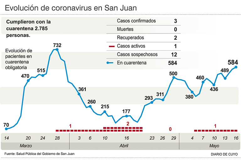 La octava semana epidemiológica desde que comenzó la cuarentena transcurrió sin nuevos casos de coronavirus. Así, a casi dos meses desde que el presidente Alberto Fernández ordenó el aislamiento social, preventivo y obligatorio, el 20 de marzo, San Juan acumula tres positivos de coronavirus, de los cuales sólo uno sigue con la infección en curso y los otros figuran en el casillero de recuperados. A su vez, el parte diario del Ministerio de Salud Pública reportó que hay 12 hisopados a la espera de resultado y descartaron nada menos que 120 por dar negativo, para totalizar 500 en la semana.