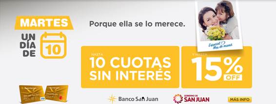 Si tenés las tarjetas de crédito de Banco San Juan, todos los martes de octubre, podés aprovechar beneficios en más de 290 comercios adheridos en toda la Provincia con importantes descuentos y hasta 10 cuotas sin interés, con la promo “Martes, un día de 10” para regalar a las mamás en su día. Estos comercios pueden consultarse en www.bancosanjuan y geolocalizarse descargando la APP BSJ móvil en el celular.