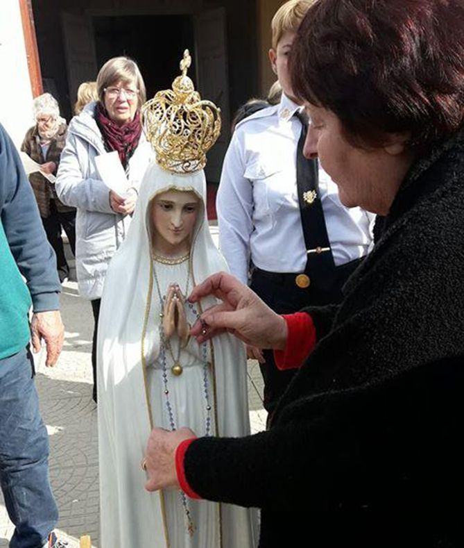 La imagen peregrina de la Virgen de Fátima es una réplica autenticada de la imagen oficial que se encuentra en el santuario de Portugal, realizada siguiendo las indicaciones de sor Lucía, una de las niñas a las que se le apareció la Virgen. Desde 1947 recorre el mundo entero para llevar un mensaje de paz.