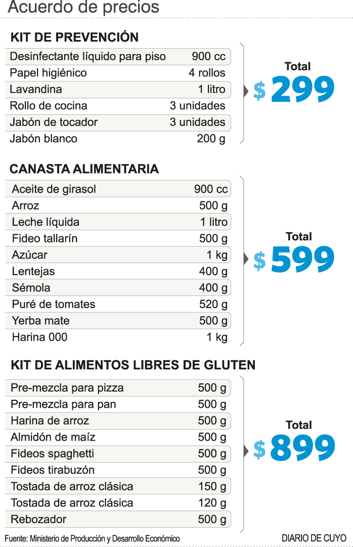 El acuerdo de precios con los supermercadistas, que ahora se llama "Elegí bien, comprá mejor" en lugar de Precios Acordados, como se había venido denominando, continuará por tercer mes consecutivo y sin variantes en los valores de los artículos. Se trata de tres bolsones, uno de limpieza, otro de comestibles y el tercero es un kit básico de alimentos libres de gluten destinados a personas celíacas, por un valor de 299 pesos, 599 pesos y 899 pesos, respectivamente. Se trata de valores hasta un 15% más baratos que los que se pueden conseguir en cualquier mercado en la provincia.