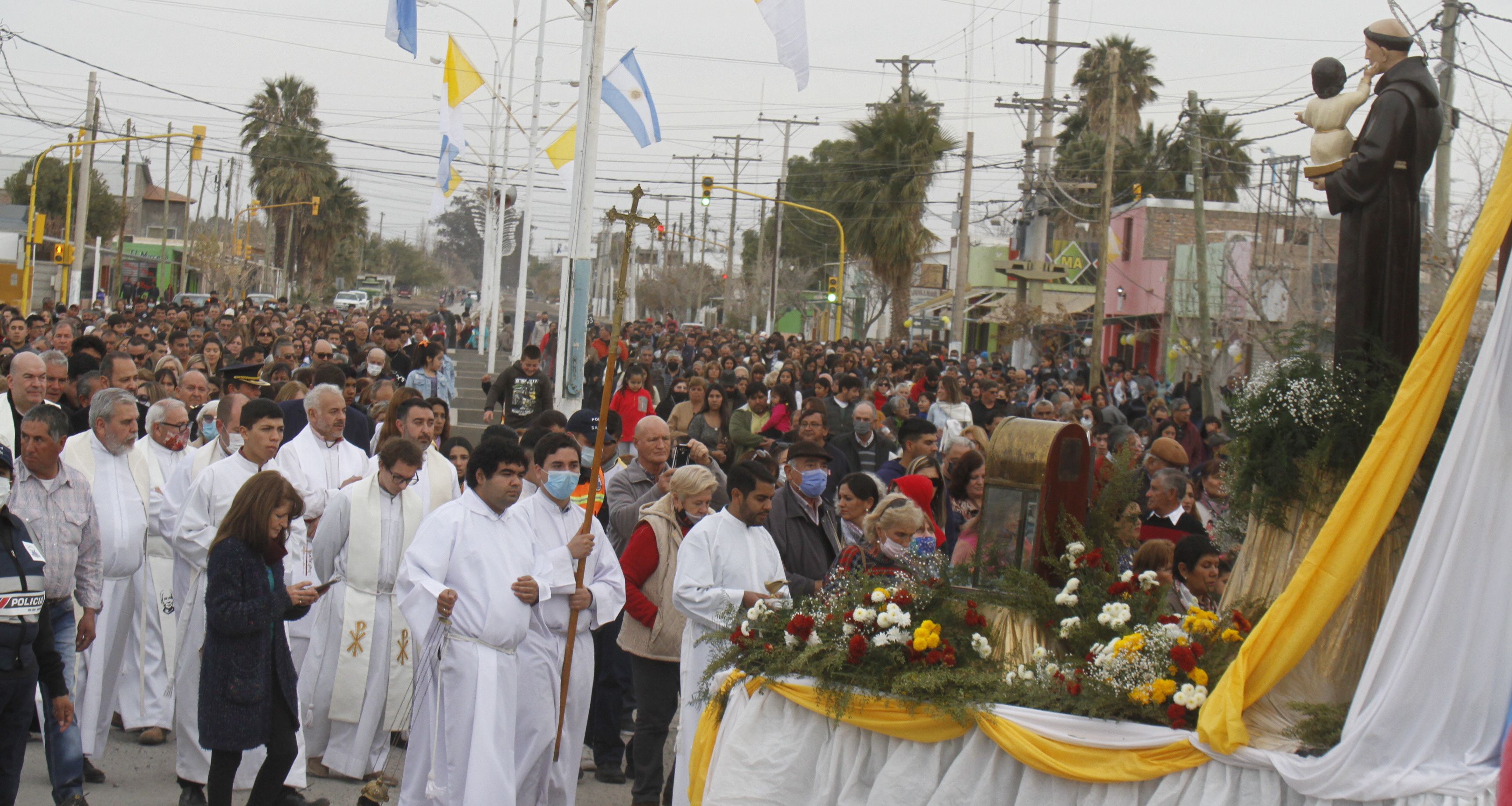 Como de manera tradicional, el sol se hizo presente en la procesión que se desarrolló en Media Agua, en honor a San Antonio de Padua. Ayer, durante la siesta, los fieles de todos los departamentos, quienes recorrieron muchos kilómetros, coparon los alrededores de la parroquia mediagüina para esperar la peregrinación que volvió a realizarse luego de 2019. De la marcha, que se realizó por las calles del corazón de Sarmiento, participaron más de 9.000 personas, dijeron desde la Policía, y a pesar de la multitud todo fue una fiesta y se extendió hasta la noche. La mayoría de los fieles comentó que este año decidió ir a hasta Media Agua a agradarle al santo los favores concedidos.