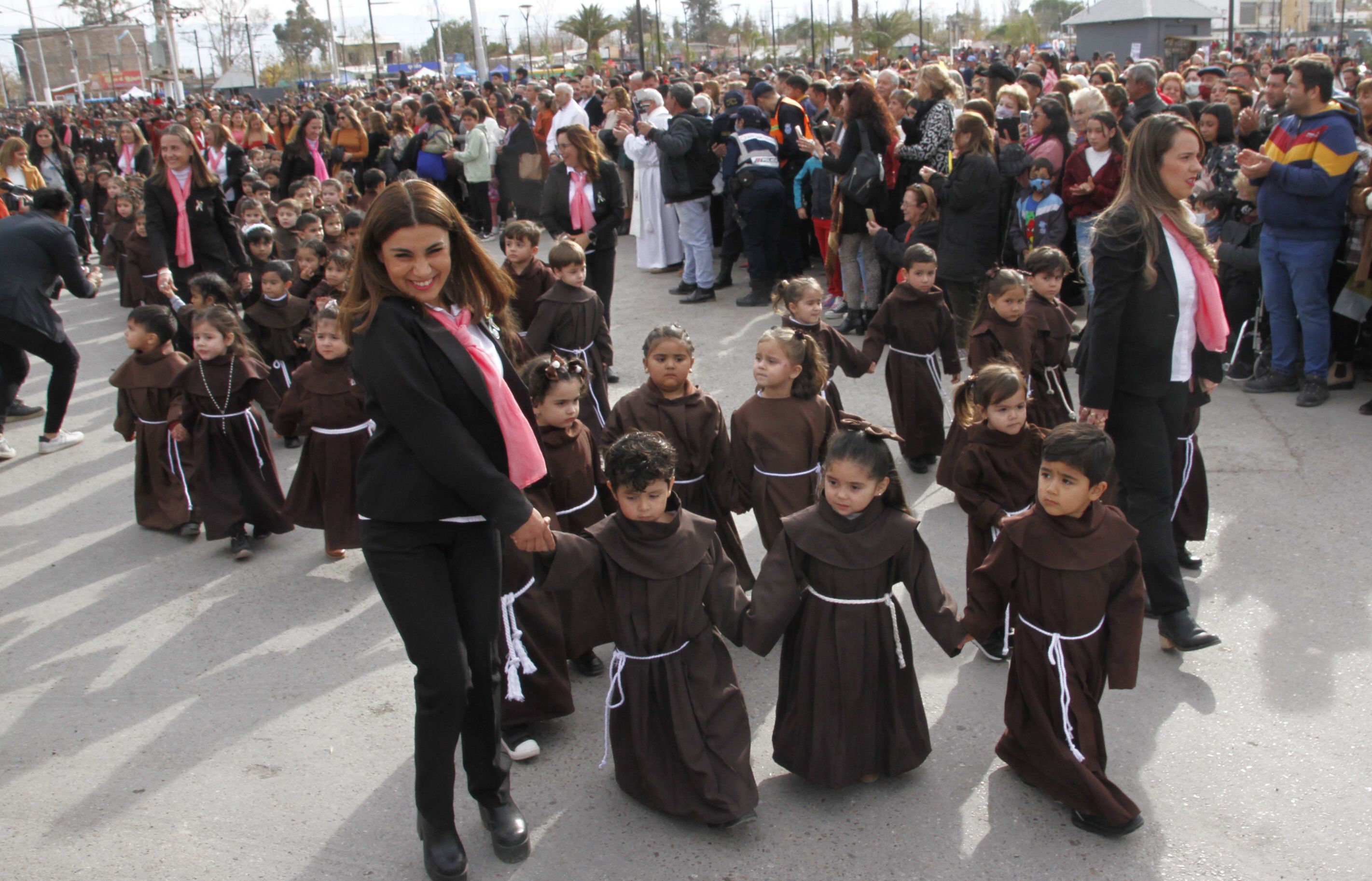 Durante el desfile de escuelas, clubes y academias, los niños del Colegio San Antonio de Padua representaron al patrono de Sarmiento con su atuendo y fueron ovacionados.