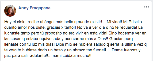 "Dios mío si hubiera sabido q sería la última vez q te veía te hubiese dado un beso y un abrazo tan fuerte!" (sic), escribió en otra parte de la desgarradora publicación, que acompañó con una foto de Priscila.