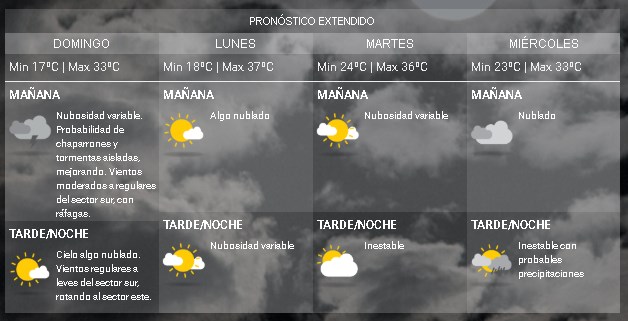 Según lo previsto, durante la noche del sábado y la madrugada del domingo llegaría el viento Sur que marcará el descenso de la temperatura. Como consecuencia, durante la jornada venidera se espera una temperatura máxima de 33 grados.