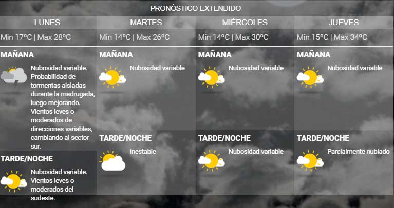 Para mañana se anuncia una máxima de 28 grados con nubosidad variable, probabilidad de tormentas aisladas durante la madrugada, luego mejorando. Vientos leves o moderados de direcciones variables, cambiando al sector sur.
