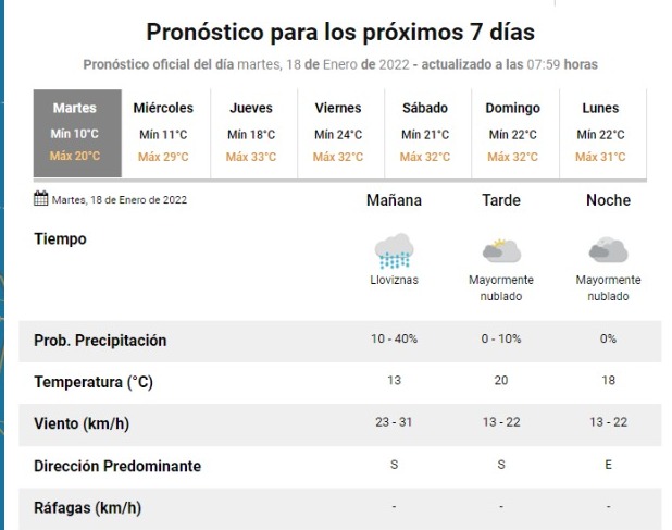 Para mañana se espera una temperatura máxima de 29 grados con viento del sector Sudeste y cielo parcialmente nublado.