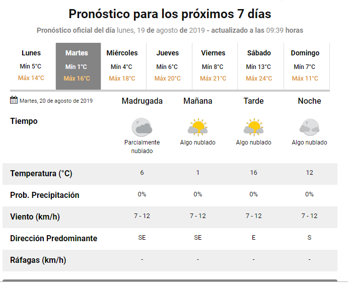 El pronóstico indica que la temperatura irá subiendo paulatinamente con el pasar de los días. Para este martes se espera una mínima de 1 grado y una máxima de 16, con el cielo algo nublado.