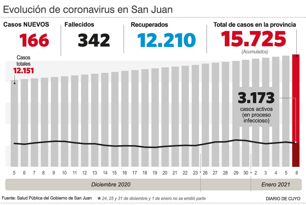 En San Juan sin embargo se mantiene estable la evolución de la pandemia, con 166 nuevos casos reportados ayer y otra personas fallecida, una mujer de Capital de 80 años.