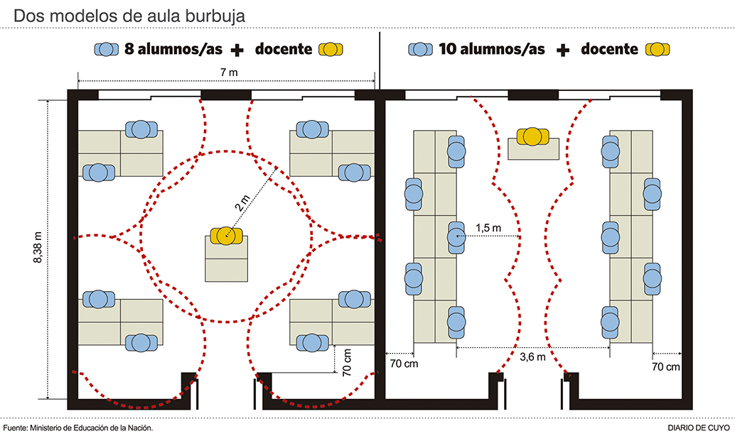 El borrador de protocolo tiene más de 70 páginas y en él se indica hasta cómo se harán las salidas y viajes educativos, cuando el 100% de los alumnos estén en clases. "También se incluye cómo se harán los actos escolares. La idea es que sean remplazados por clases alusivas a esa efeméride. Esto, para evitar que todos los chicos se reúnan en un mismo salón", dijo Lucero y agregó que se deberá garantizar la higiene del edificio, el desmalezado de las inmediaciones, la cantidad suficiente de insumos, la incorporación de jabón y alcohol en los baños; y la cantidad de agua potable suficiente para todas las jornadas, entre otras cosas. Además, según un documento que circula en el Ministerio de Educación, similar a los que se estuvo informando a nivel nacional, los alumnos volverán a clases en "aulas burbujas". Dijeron que se los dividirá por grupos en función del espacio físico de cada aula, para que haya un metro y medio de distancia mínima entre uno y otro, a la vez que todos deberán ir con barbijos, al igual que las docentes. La distribución que propone el "modelo burbuja" es con alumnos agrupados a los lados del aula y el docente en el centro, o con los alumnos sentados en zig zag hacia los costados (ver infografía).