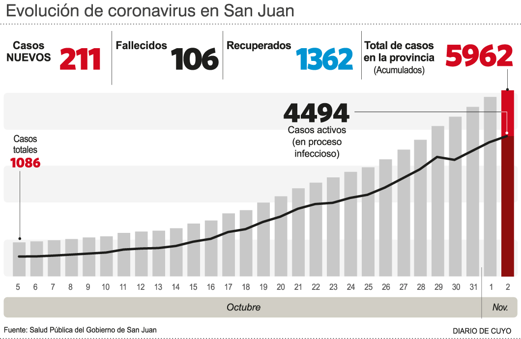 Una mujer de 62 años, de Albardón; y un hombre de 81, vecino de Rivadavia, murieron ayer a causa de Covid-19. Ambos estaban internados en hospitales públicos y sus decesos ampliaron la lista de fallecidos en San Juan, pues ahora son 106. El domingo, después de 10 días seguidos, no habían reportado nuevas muertes, pero la circunstancia no pudo extenderse ni 24 horas.