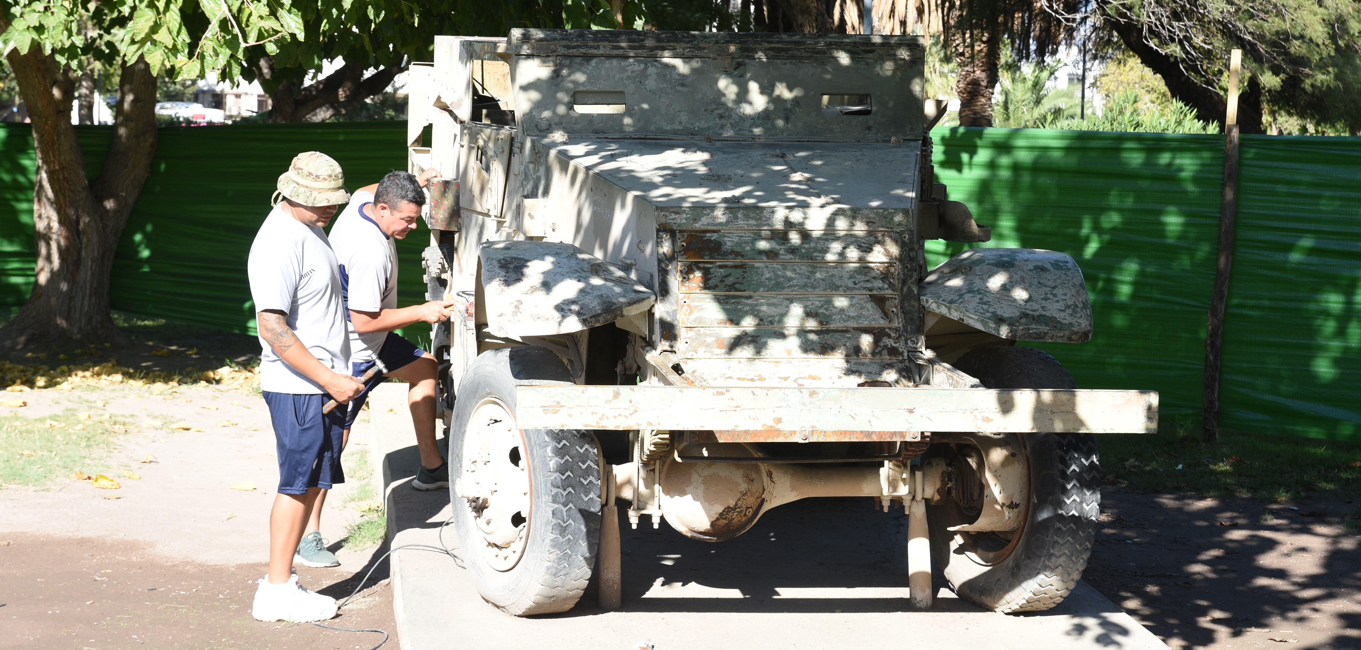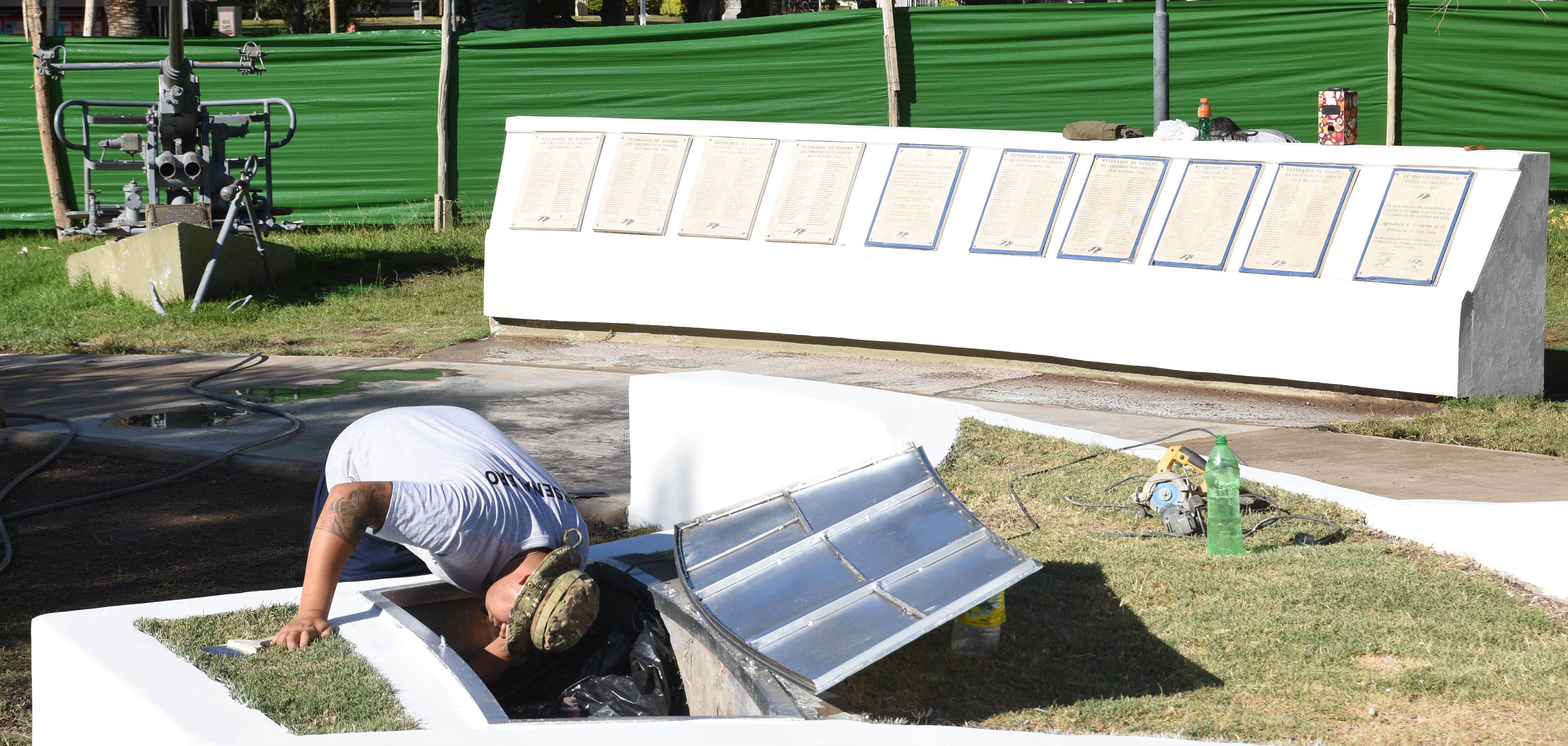 Lo que falta terminar es el trabajo de pintura de los plaqueros y de plantación de césped para completar la obra de parquización. Paralelamente, se está realizando la limpieza y restauración de los elementos militares que hay en el sector de monumento. Son la tanqueta, avión y cañón que soldados del RIM 22 están limpiando para eliminar los graffitis en aerosol producto del vandalismo y pintarlos. Ya restauraron el busto del teniente Oscar Silva.
