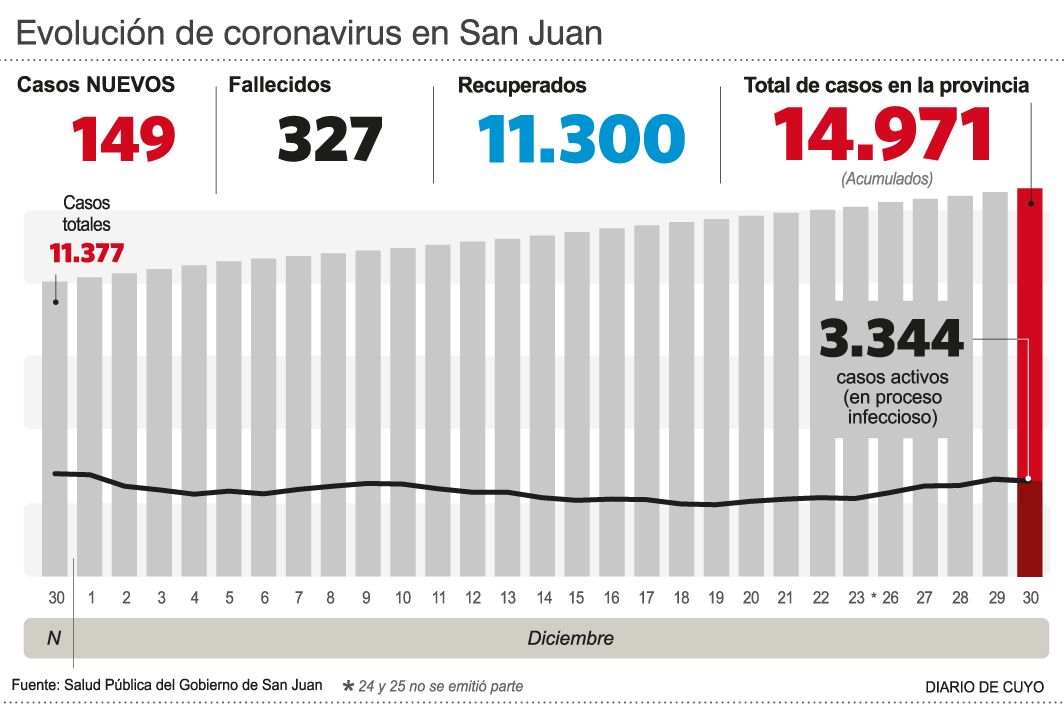 El Ministerio de Salud Pública brindó ayer el último parte del año e informó 149 nuevas confirmaciones y por ende el acumulado es de 14.971 casos. Ese fue el número de contagios que estadísticamente cierra el 2020 en San Juan. Por su parte, con la muerte de dos hombres de 65 y 92 años, de Caucete y Zonda, los fallecidos totalizaron 327. Mientras que hay 3.344 casos activos, los recuperados son 11.300. Y en terapia intensiva se encuentran 90 pacientes (26 con respirador).