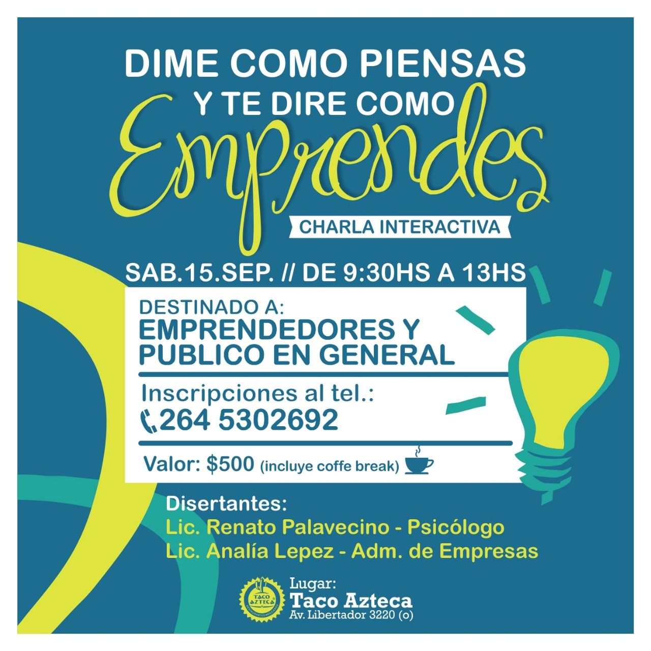 Bajo el título "Dime cómo piensas y te diré cómo emprendes", se realizará una charla interactiva, en el Taco Azteca, ubicado en avenida Libertador 3220 (Oeste), en Rivadavia.