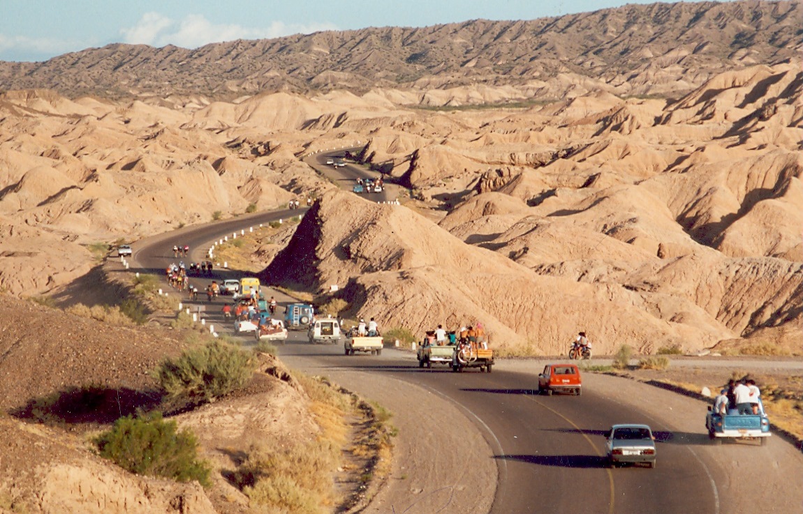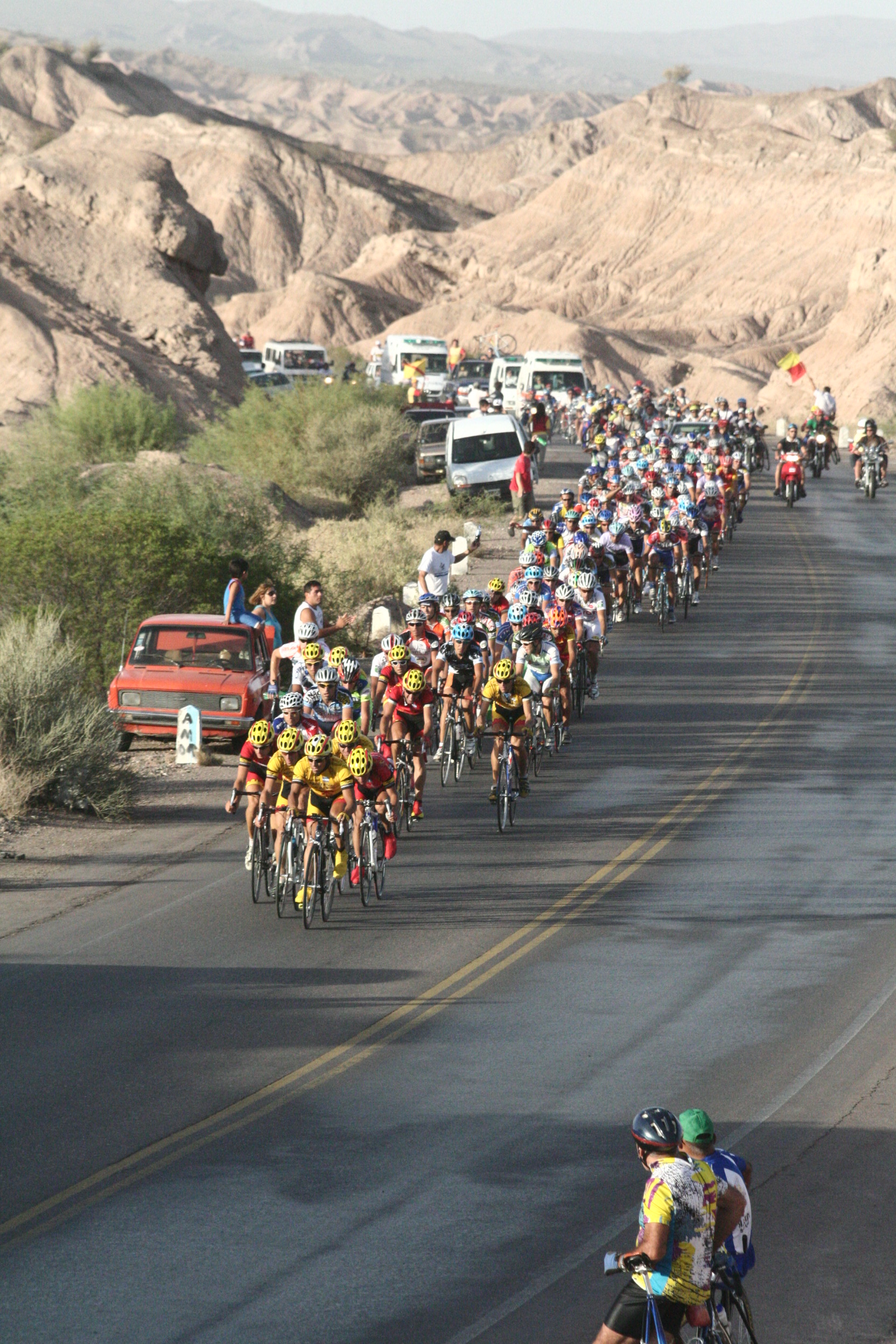 Con el paso de los años, las rutas de acceso, las playas, los cerros y el espejo de agua comenzaron a usarse para todo tipo de eventos deportivos. En la imagen, tomada en 2008, se puede ver al pelotón de ciclistas que encara la bajada posterior al paredón en la XXVI Vuelta a San Juan, el evento de ciclismo más importante de la provincia.