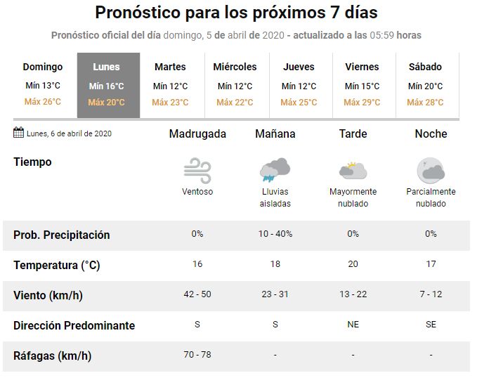 Hoy la máxima prevista es de 26 grados con viento del sector Sur y cielo parcialmente nublado. Sin embargo, durante la madrugada de mañana el pronóstico extendido indica que llegaría fuerte viento del sector Sur. las ráfagas podrían alcanzar una velocidad de 70 a 78 kilómetros por hora.