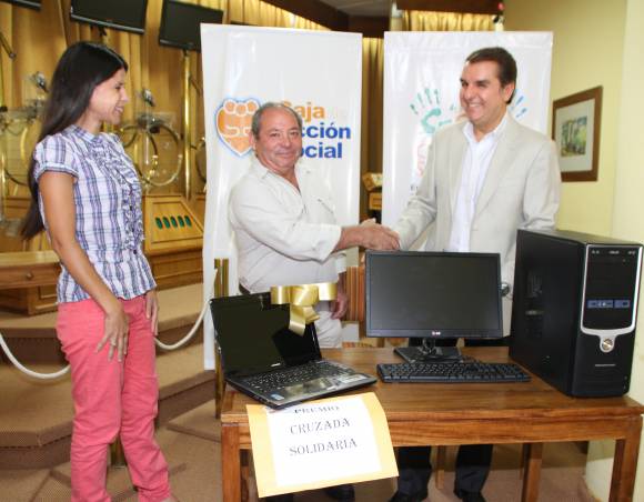 Ayer, en la sede de la Caja de Acción Social, se llevó a cabo la entrega de los premios correspondientes al último sorteo de la Cruzada Solidaria que incluye la entrega de computadoras (una pc y una notebook) a escuelas rurales de la provincia que se inscriban para participar de este sorteo.