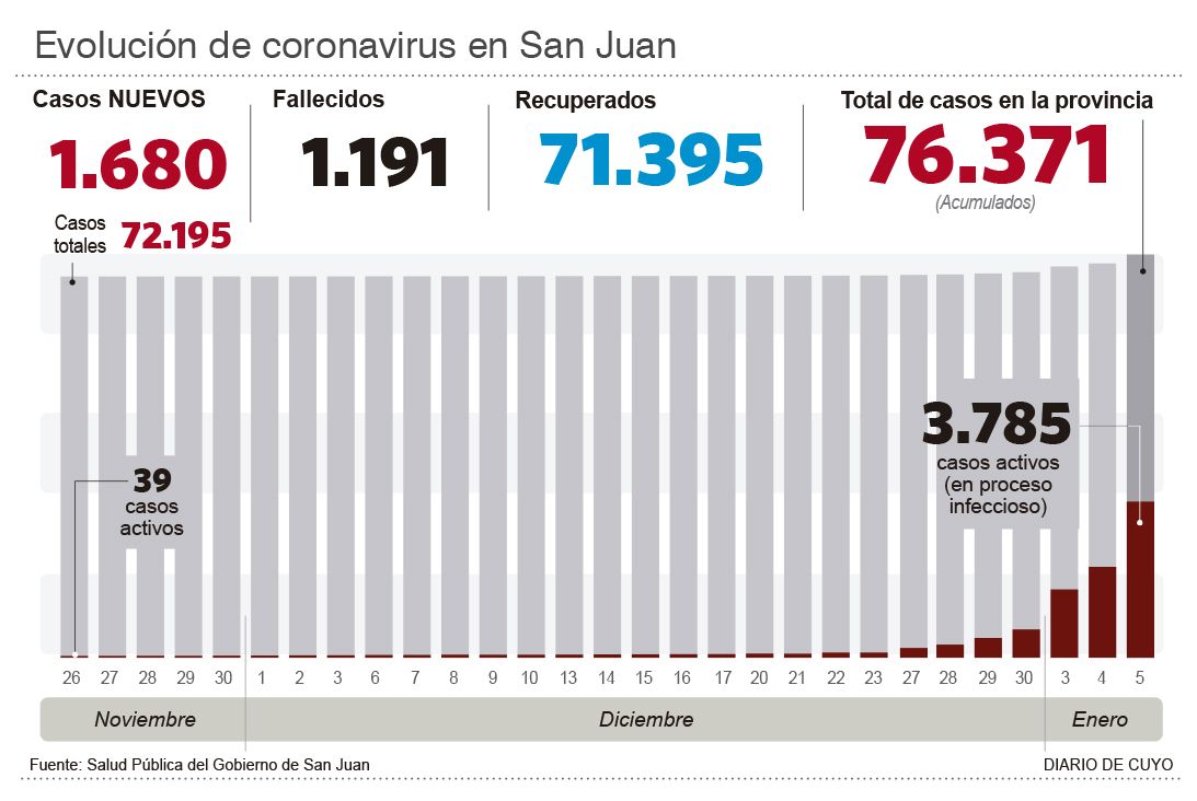 Ayer Salud Pública informó que en la última jornada hubo 1.680 nuevos casos de covid en la provincia. Es más del doble del máximo histórico que se había alcanzado en un solo día el 28 de mayo pasado, de 790 casos. El dato surge en medio de una demanda también altísima de gente que se hace el test (sólo el martes fueron 4.000), y pese a la cifra, ayer no hubo muertes y sigue baja la tasa de internados.