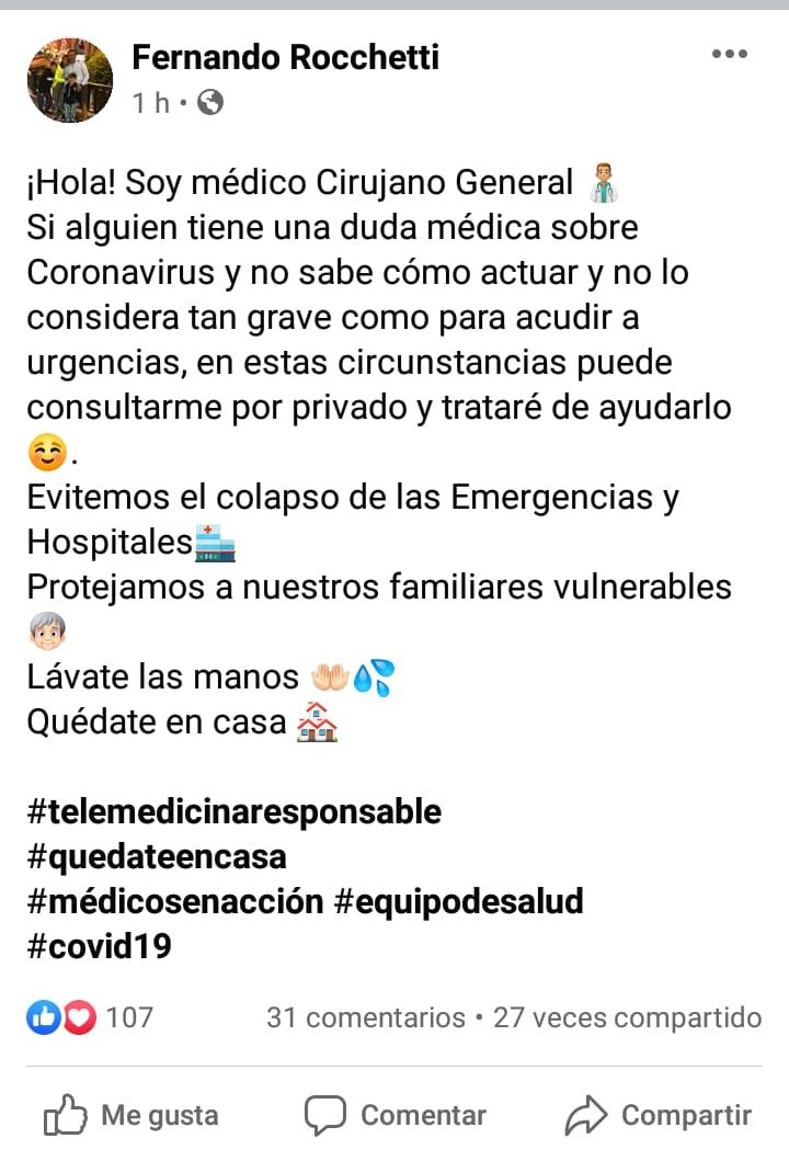 De esta manera, el doctor Rocchetti se puso a disposición de la comunidad vía online y aconsejó: "Evitemos el colapso de los hospitales". Además, recordó la importancia de lavarse las manos y "quedate en casa".