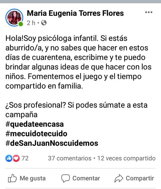 "Si estás aburrido y no sabés que hacer en estos días de cuarentena, escribime y te puedo brindar algunas ideas de qué hacer con los niños", destacó.
