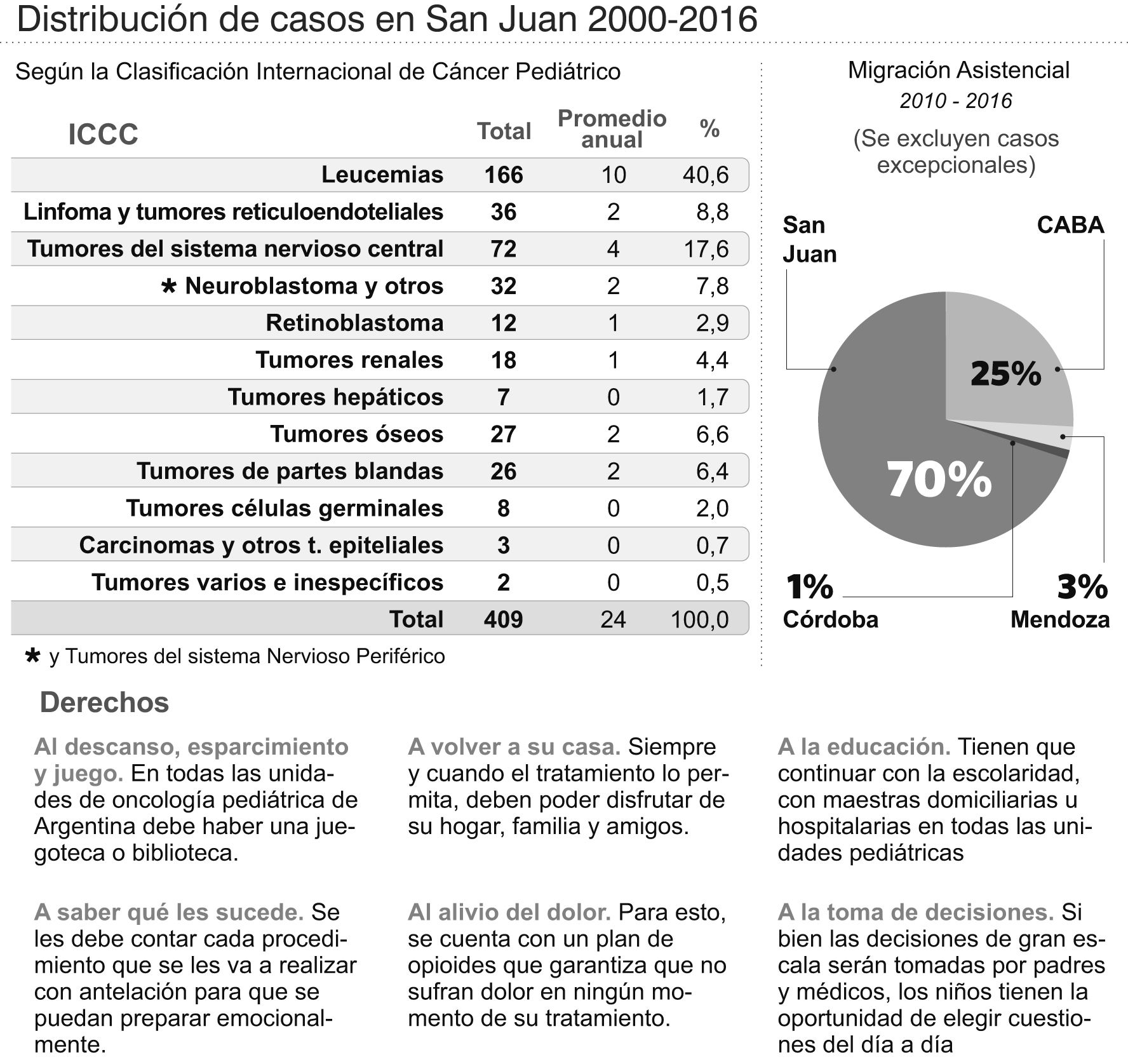 En San Juan, por año se diagnostican cerca de 30 nuevos casos de cáncer infantil y el 40% de los casos se trata de leucemia. Los pacientes de hasta 18 años de edad son contemplados como casos de cáncer pediátrico en el Hospital Rawson y la jefa del Servicio de Hemato-Oncología, María Elizabeth Arrieta, indicó que se plantean nuevos desafíos para el tratamiento oncológico a adolescentes, el grupo "más rebelde" en respetar las indicaciones.