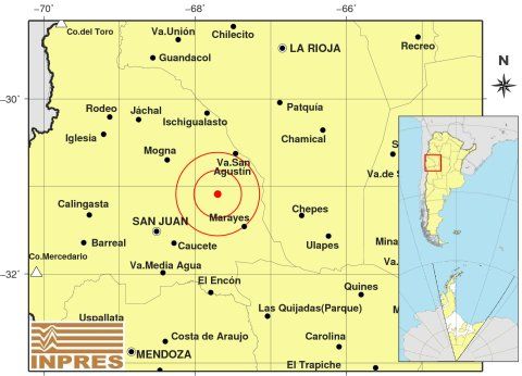 El movimiento se produjo a las 3,20, con epicentro a 90 km al NE de San Juan, 204 km al SO de La Rioja, 53 km al NO de Marayes.