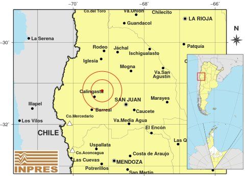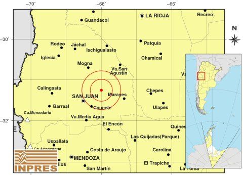 El primero de los temblores se registró a las 23,56 de este martes, a una profundidad de sólo 6 kilómetros, en la zona de Caucete, 56 kilómetros al Noreste de San Juan y 48 kilómetros al Noroeste de Bermejo.