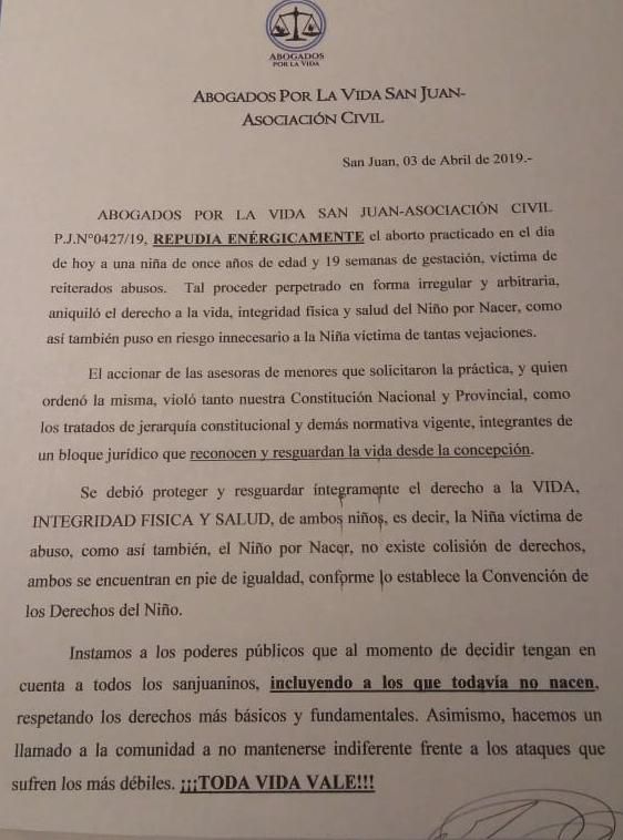 Por este motivo, desde la asociación civil Abogados por la Vida San Juan enviaron un comunicado donde manifestaron su repudio a la interrupción de la gestación de la nena. Aseguran que "tal proceder" fue "perpetrado en forma irregular y arbitraria" y "aniquiló el derecho a la vida, integridad física y salud del Niño por Nacer".