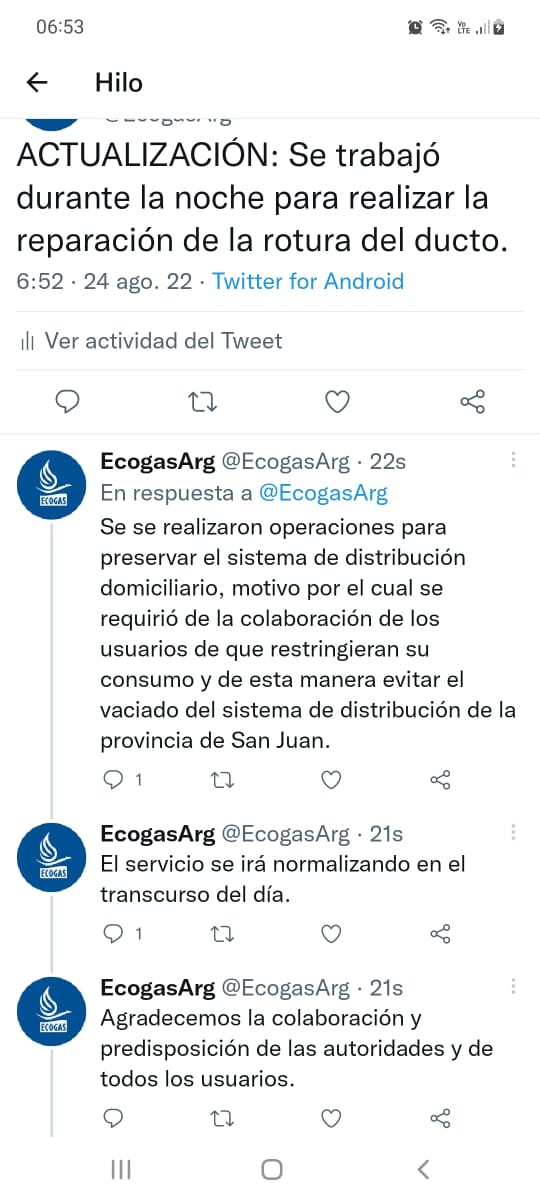 Después de trabajar durante varias horas, la noche incluida, desde ECOGAS confirmaron que se reparó el gasoducto de alimentación de gas natural de San Juan sufrió ayer una rotura inédita a 30 kilómetros de la Capital provincial lo que produjo el corte de GNC en todas las estaciones de servicio desde las 15 horas, restringió el gas a las industrias y el consumo residencial.