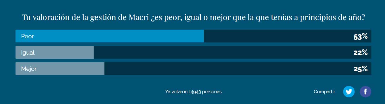 Para poco más de la mitad de los lectores que participaron de la encuesta de DIARIO DE CUYO, la gestión del presidente Mauricio Macri empeoró en el último año.