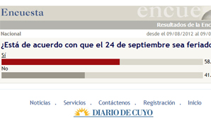San Juan, 10 de Agosto.- Los lectores de DIARIO DE CUYO ONLINE se mostraron a favor de que el 24 de septiembre sea declarado, por única vez, feriado nacional en conmemoración del bicentenario de la Batalla de Tucumán.