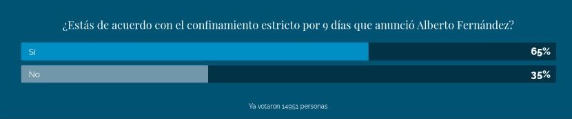 La pregunta, a la que respondieron 14.951 personas, fue "¿Estás de acuerdo con el confinamiento estricto por 9 días que anunció Alberto Fernández?".