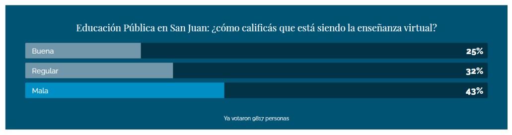 Mediante una encuesta que se realizó en la página web de Diario de Cuyo, los lectores opinaron al respecto y el 75% calificó como "regular o mala" la calidad de la educación virtual. En este sentido, el 43% la tildó de "mala" mientras que el 32% de los votantes seleccionó la opción "regular".