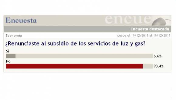 De 619 lectores, un 93.4% dijo no haber renunciado a los subsidios, es decir que 578 personas aún mantienen los beneficios de descuentos impositivos. Mientras que sólo 41 personas del total que participó en la encuesta, un 6.6%, afirmó que ya no goza de los subsidios en las boletas de servicios.