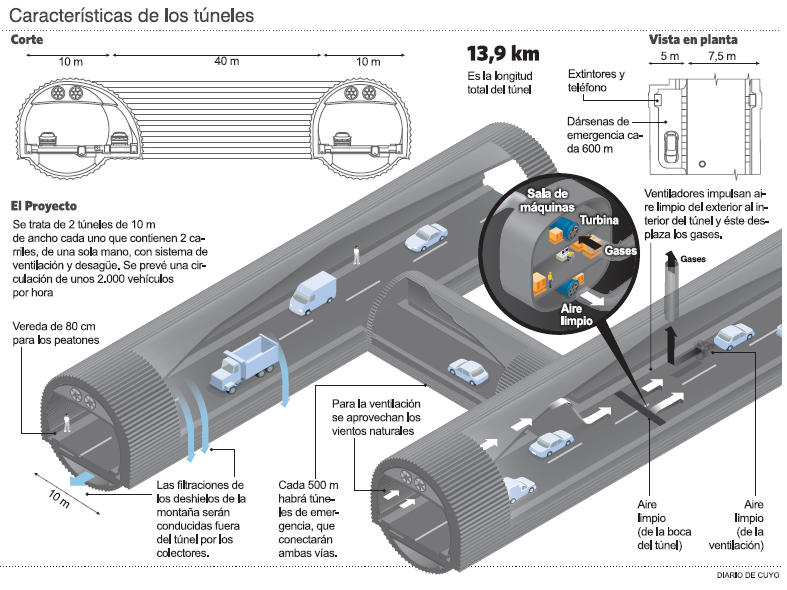 La obra vial más importante de la región implicará la construcción de dos túneles, uno de ida y otro de vuelta. Cada uno tendrá una extensión de 13,8 kilómetros de largo y 12 metros de diámetro, y estarán separados entre sí por 90 metros. La vinculación entre ellos será cada 500 metros mediante galerías de ventilación y túneles transversales de diferente diámetro que servirán también para la circulación de vehículos ligeros.