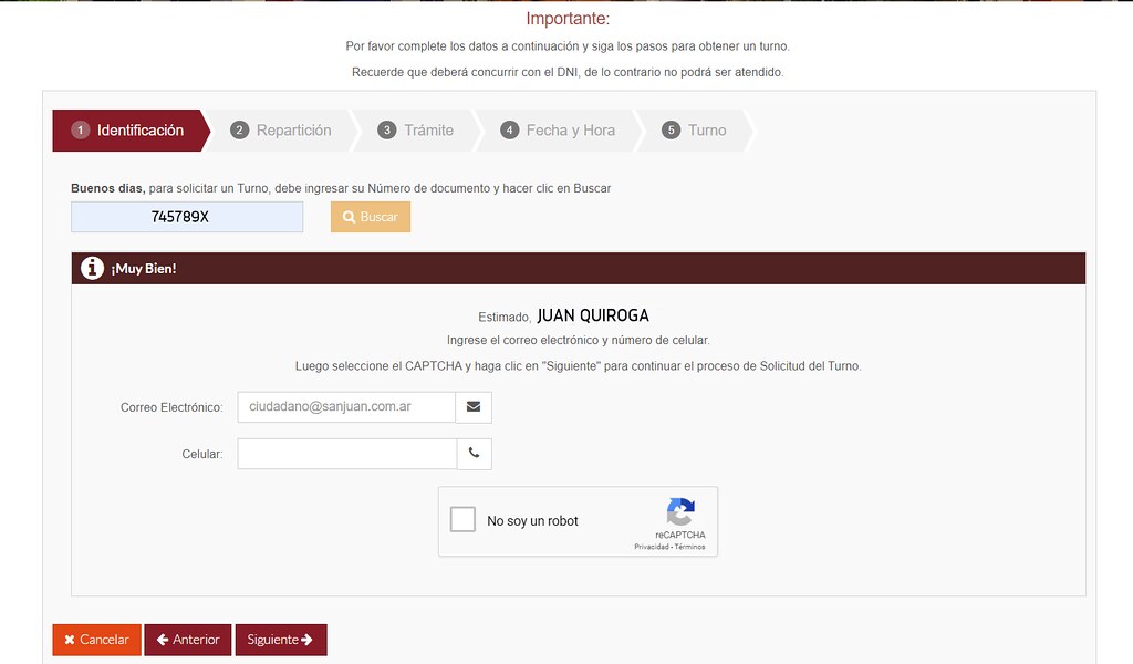 3. Una vez cargado tu DNI, ingresá tu correo electrónico y número de celular. Luego seleccioná el CAPTCHA y hacé click en "siguiente" para continuar el proceso de solicitud del turno.