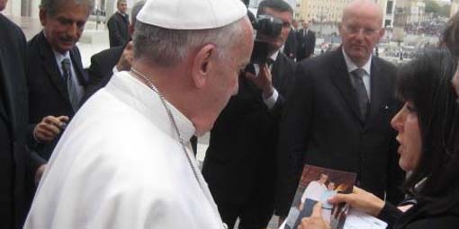 San Juan, 22 de Noviembre.- El Papa Francisco bendijo en la última audiencia pública del miércoles una foto del gobernador Gioja. Adriana Eleonora Romero de Figueroa es la mujer que le acercó la imagen al Sumo Pontífice, le comentó sobre el accidente y le pidió la bendición para el primer mandatario provincial.