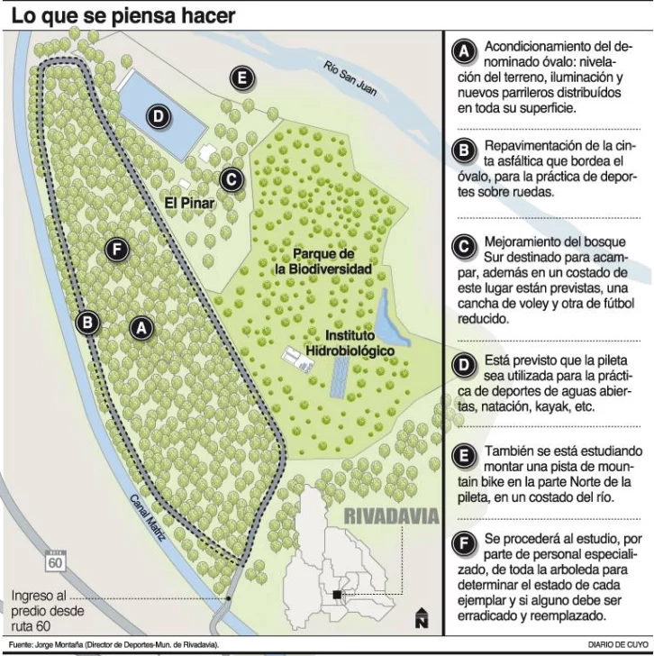 Montaña también habló de las obras que se harán en el interior del camping (el sector pago). Dijo que la pileta, de 100 metros de largo por 50 metros de ancho, se seguirá usando para la práctica de natación y kayak, que se complementarán con otras disciplinas deportivas para el desarrollo de un duatlón o triatlón.