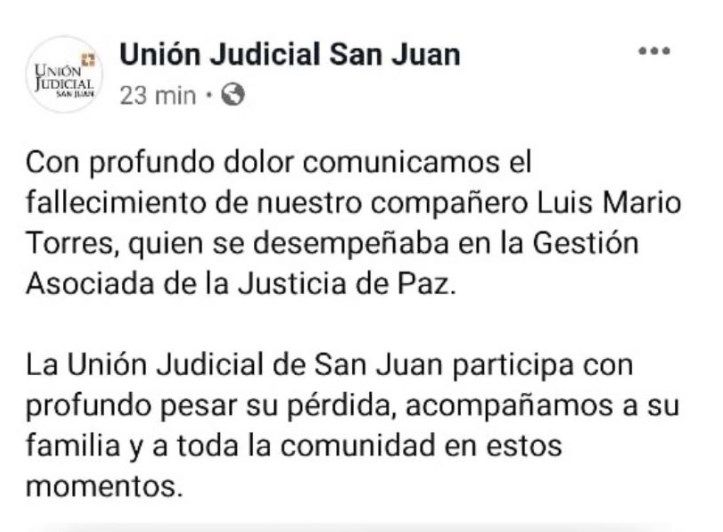 Este sábado, desde la Unión Judicial de San Juan informaron un nuevo deceso. Se trata de Luis Mario Torres, otro trabajador del fuero judicial, que desempeñaba tareas en la Gestión Asociada en la Justicia de Paz.