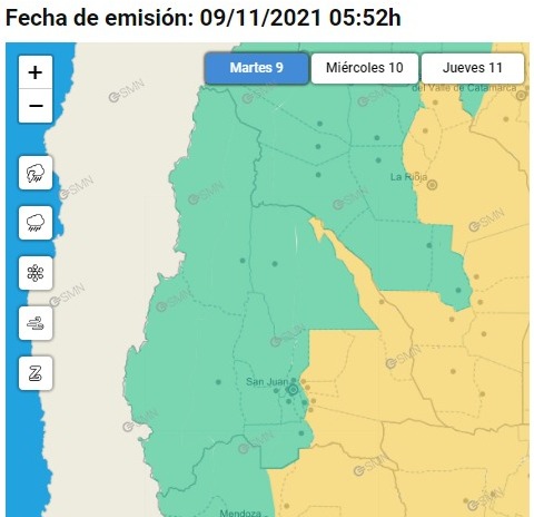 El informe indica que la zona  comprendida por los departamentos de 25 de Mayo, Angaco, Caucete, San Martín y Valle Fértil  se verá  afectada por "tormentas, algunas localmente fuertes, pudiendo estar acompañadas por intensas ráfagas, fuerte actividad eléctrica, ocasional caída de granizo y fundamentalmente abundante caída de agua en cortos períodos. Se esperan valores de precipitación acumulada entre 20 y 50 mm, pudiendo ser superados de forma puntual".
