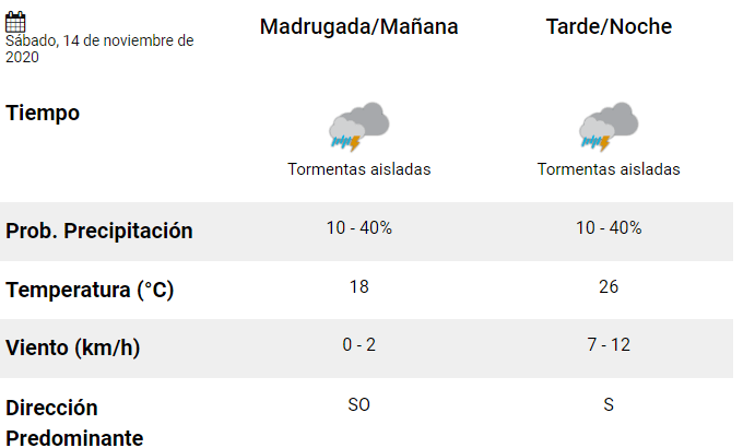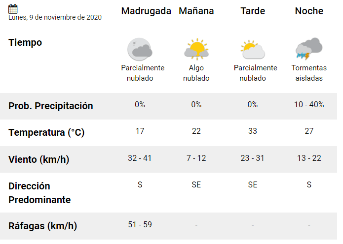 *Domingo: la jornada de hoy, en la que se esperan tormentas aisladas, terminará con un fuerte ventarrón de viento del sector Norte. Las estimaciones   es que las ráfagas de viento lleguen a los 69 kilómetros por hora.