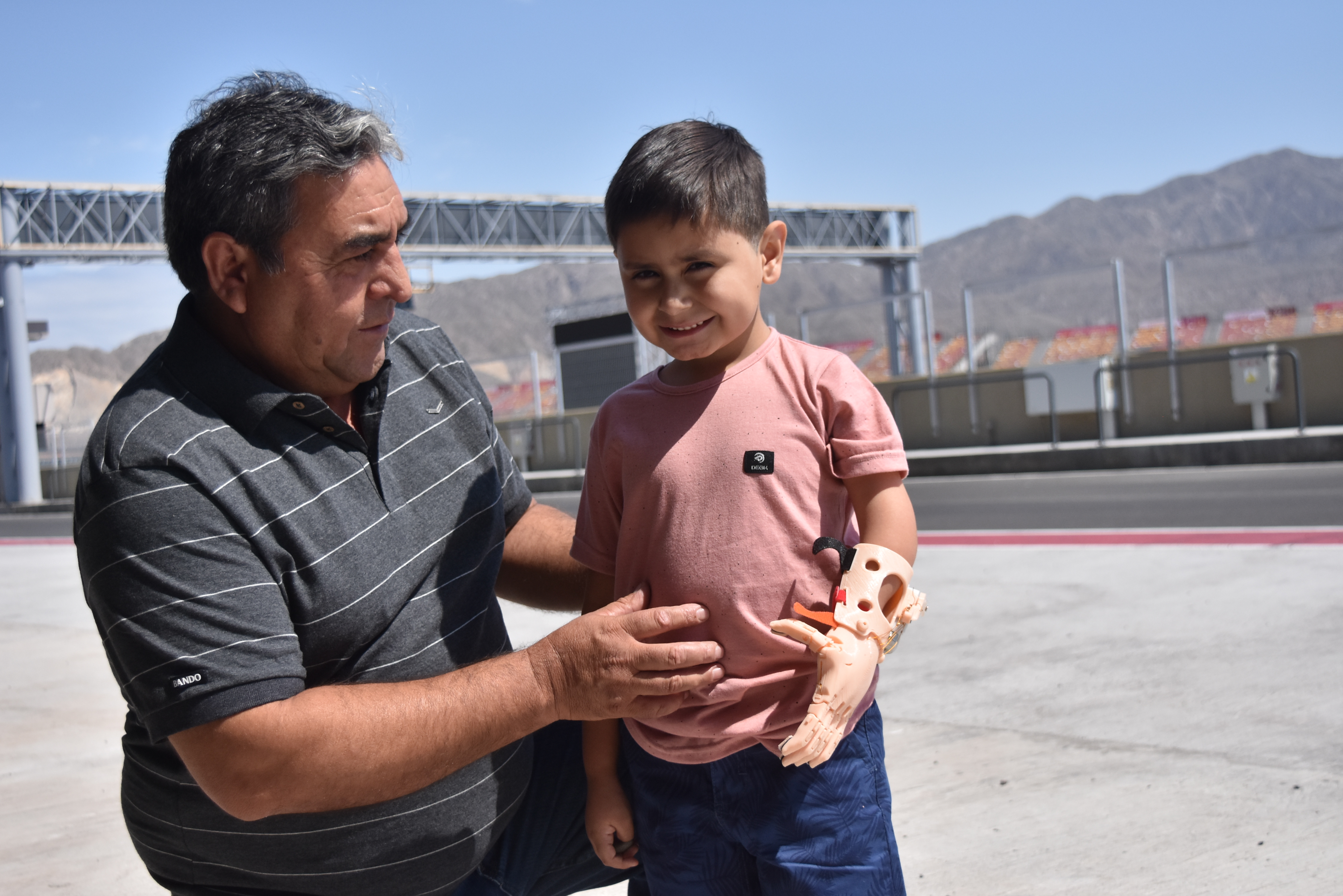 Joaquín se dio cuenta en el autódromo que se había olvidado la batería de su mano ortopédica. Esa situación le dio un poco de vergüenza y le costó tomar coraje para posar para la foto. Sus familiares lo alentaron para que se alegrara.